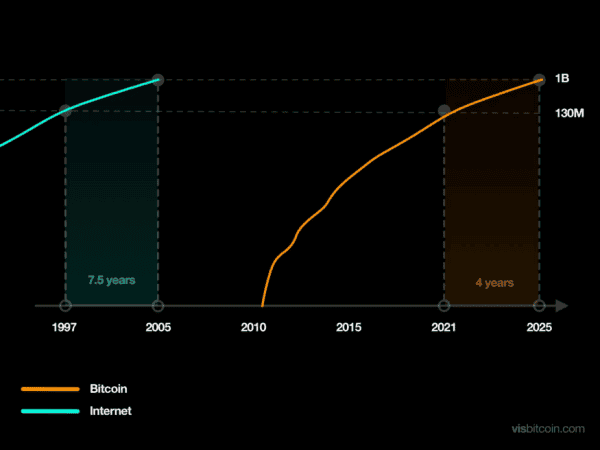 In terms of adoption, Bitcoin has roughly the same amount of users as the internet did back in 1997. However, Bitcoin is growing at a faster rate. If this continues, we may very well have over one billion users within the next four years.