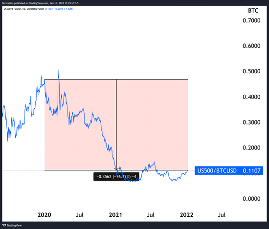 Despite the mostly positive correlation between the two assets over the past 24 months, the S&P 500 is down by 76% in BTC terms since the start of 2020.