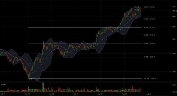 The first thing that pops out about this trend is the decrease in volume (shown in pink) leading into this morning’s all-time high. Upon reaching that high, sell volume began to pick up considerably (labeled in blue) and has continued to remain strong during the push into the $4300 and $4200 prices. The previous all-time highs (labeled in yellow) are currently paired with a decreasing MACD moving average/signal line trend that indicates the market is losing bullish momentum across the macro trend.